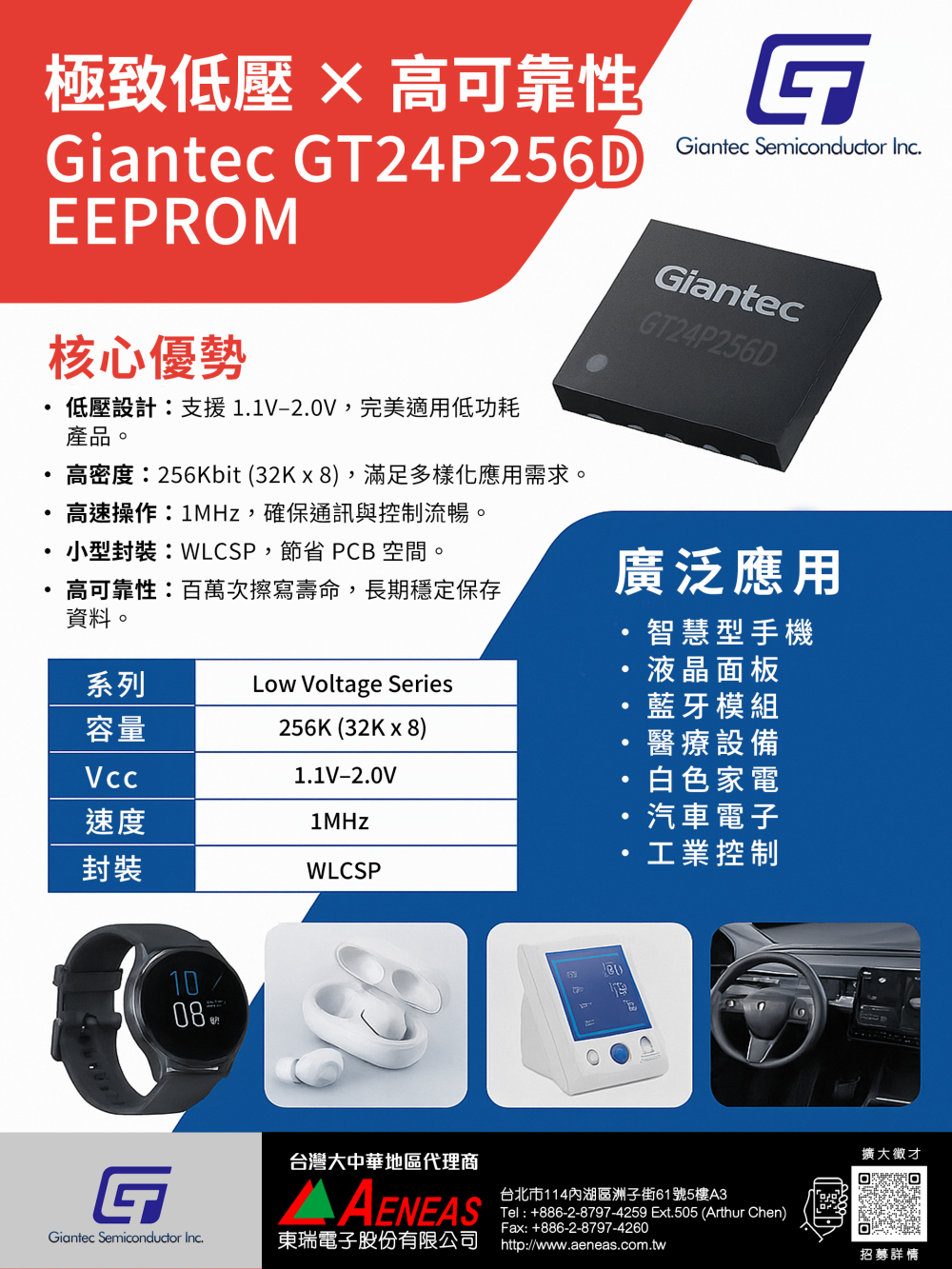 GIANTEC GT24P256D - Ultra-low-voltage 256 Kbit EEPROM in WLCSP package — ideal for wearables, medical devices, and industrial control.