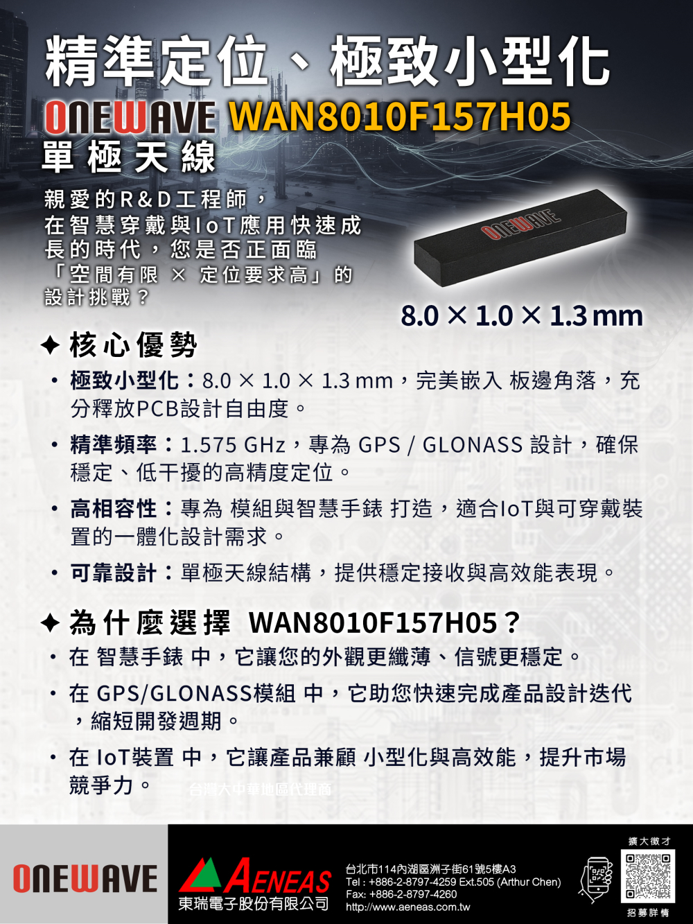 Onewave WAN8010F157H05 - Monopole antenna for GPS/GLONASS modules — lightweight, efficient, and provides stable signals for IoT devices.
