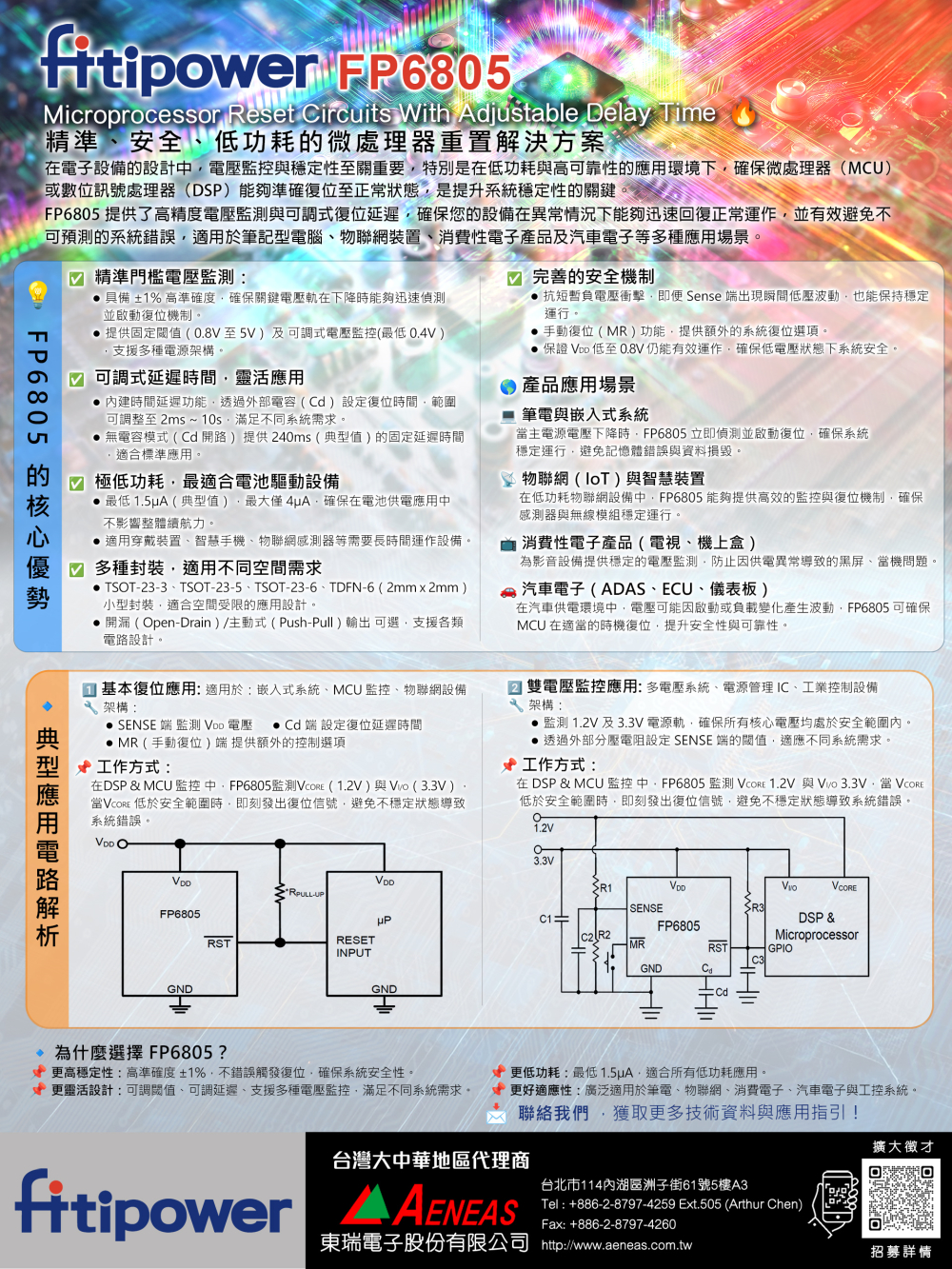 Fitipower FP6805 - 微處理器重置監控IC,具備±1%高精度電壓監測、可調延遲時間、超低功耗與多封裝選擇,適用嵌入式系統、物聯網設備與車用電子。