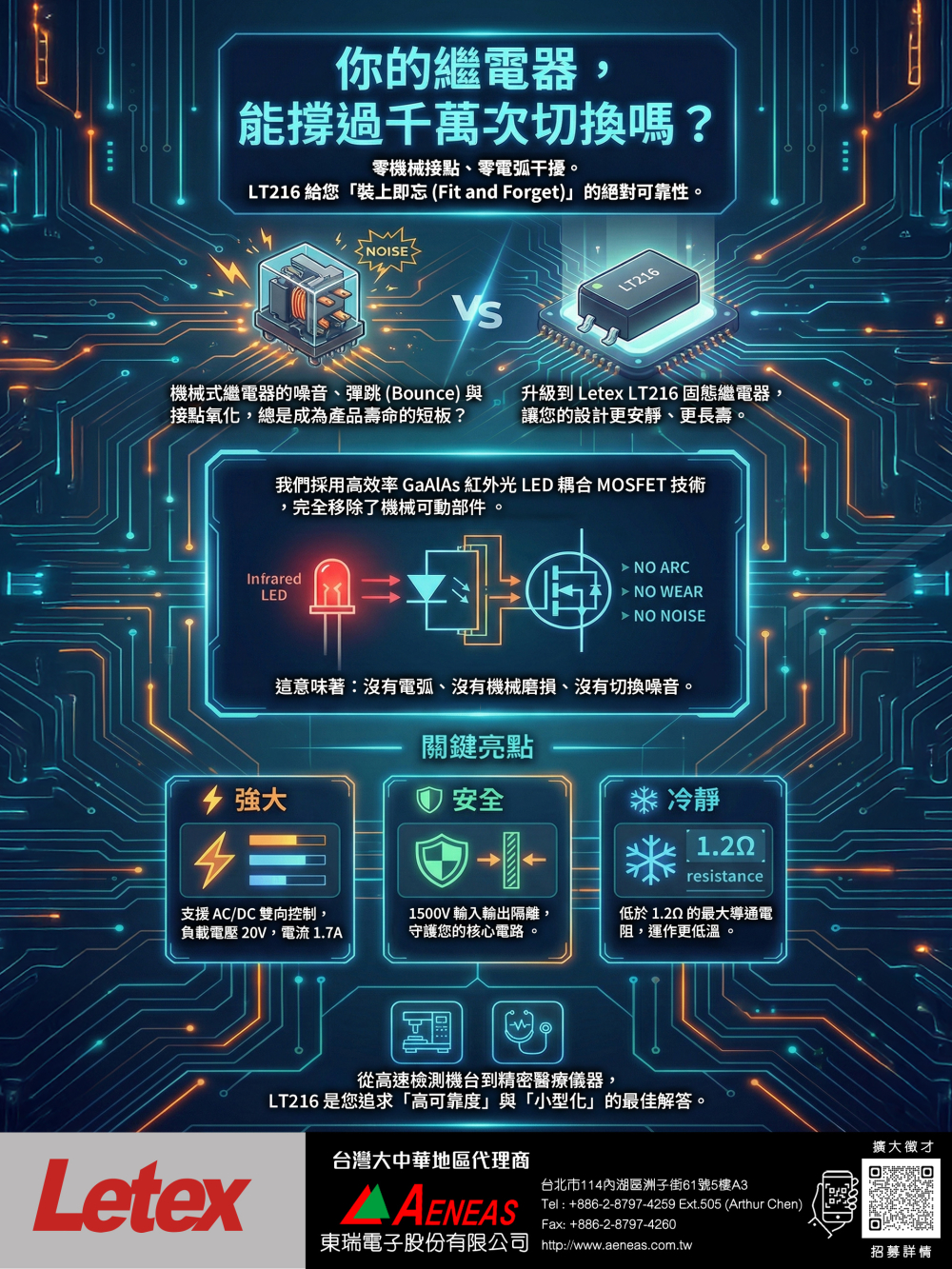 Letex LT216 - 固態繼電器(PhotoMOS SSR),紅外LED耦合MOSFET、1500V隔離、低導通阻抗、無電弧無磨損,適用測試設備、醫療儀器、自動化與高可靠控制系統。