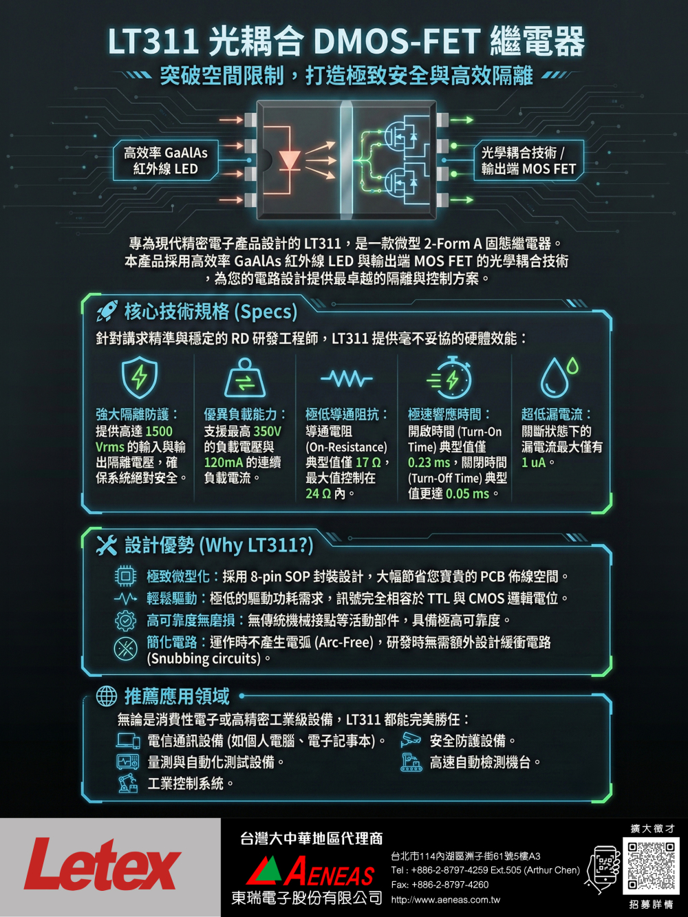Letex LT311 - 光耦合固態繼電器,1500Vrms隔離、低漏電流、低導通阻抗與高速開關特性,適用工業控制、自動化設備與精密量測系統。