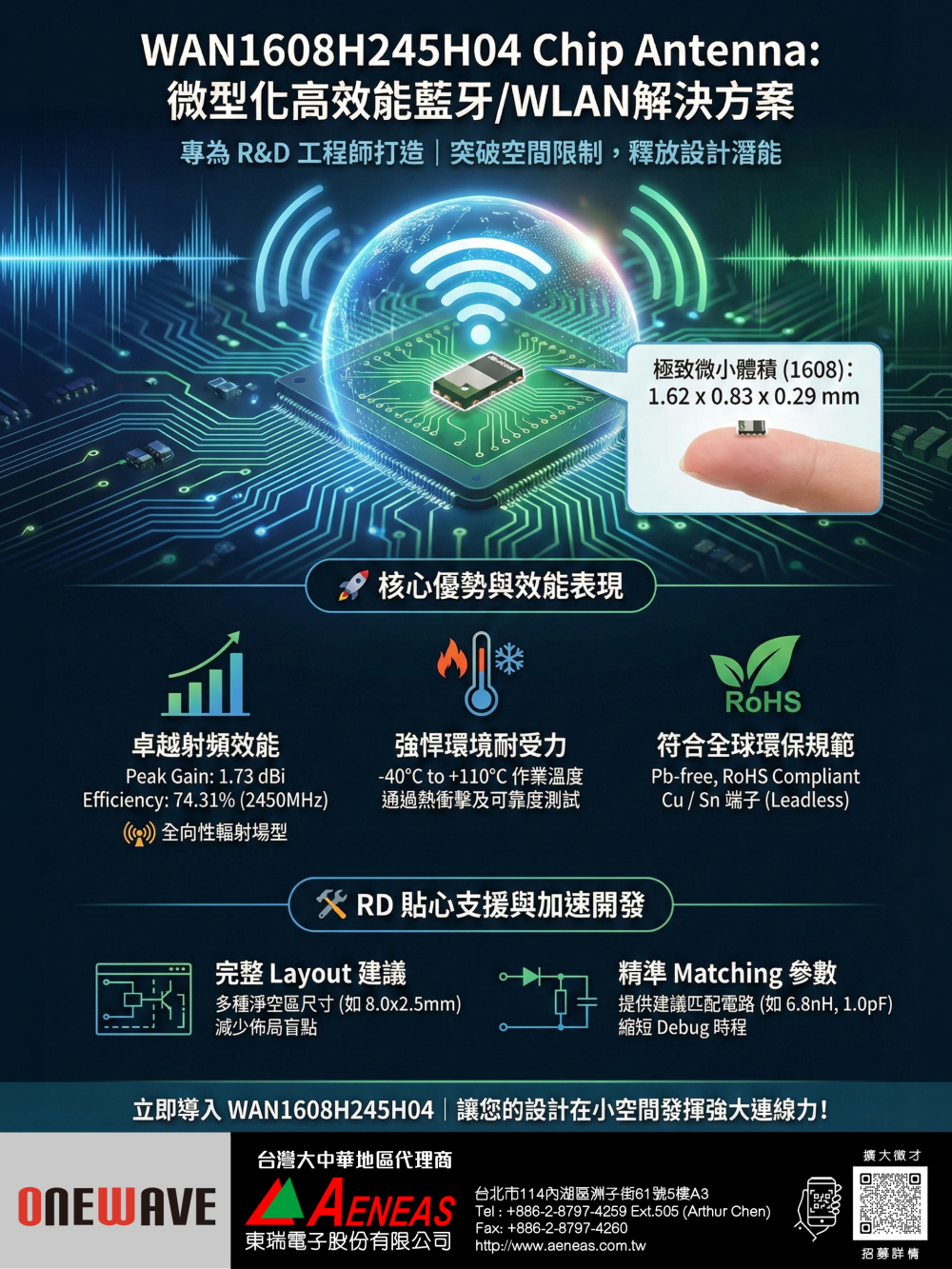 OneWave WAN1608H245H04 - 2.4GHz Chip Antenna,支援Bluetooth與WLAN應用,1608超小尺寸、1.73dBi增益、74%效率、全向性輻射,適用IoT、穿戴裝置與高密度無線模組。