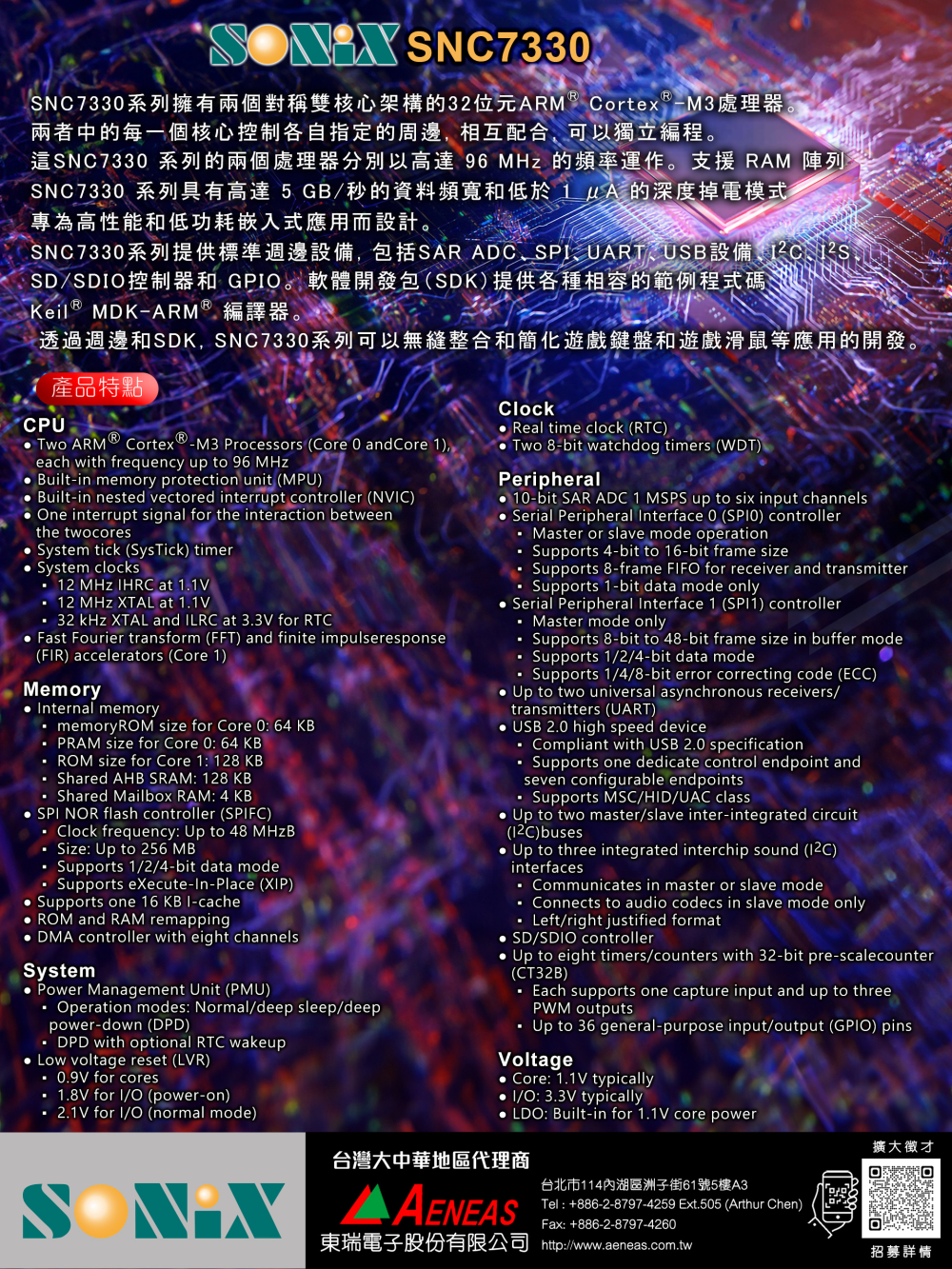 SONIX SNC7330 - 32-bit Cortex-M3 dual-core microcontroller delivering high performance and low power consumption — ideal for smart home and IoT applications.
