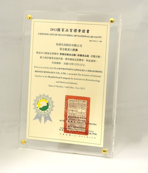 台灣兆鴻生技以『黃金蜆蛋白膠囊』( Clam Protein-可蘭普婷 )申請社團法人國家生技醫療產業策進會主辦之『2012 SNQ國家品質標章』營養保健食品類/保健食品組,獲選『SNQ國家品質標章』。
