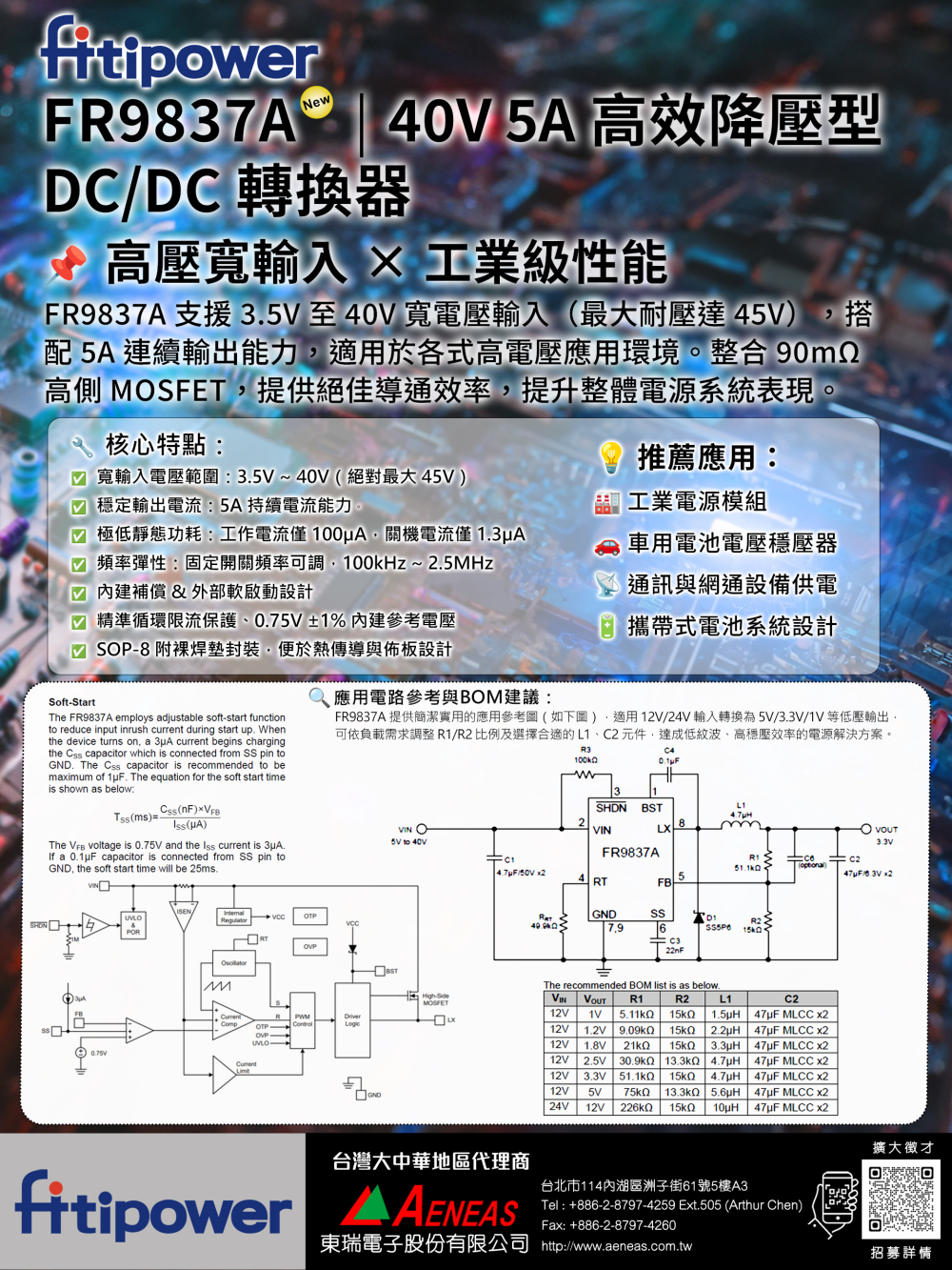 Fitipower FR9837A - DC/DC降壓轉換器,40V輸入、5A輸出,適用工業、車用與通訊設備。