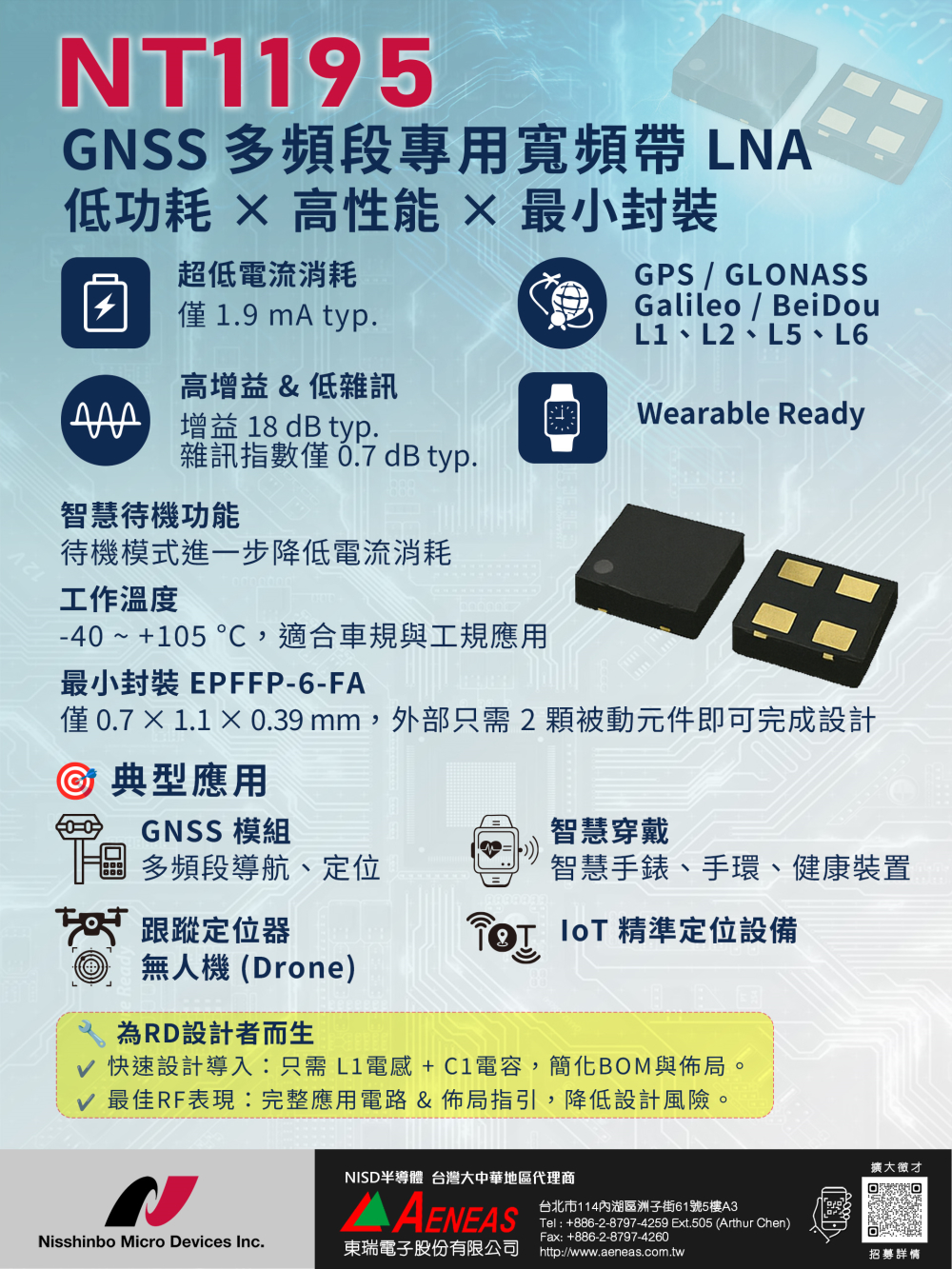 NISD NT1195 - GNSS LNA,低功耗高增益設計,支援 GPS、GLONASS、Galileo、BeiDou 多頻段應用,適用 IoT 與智慧穿戴。