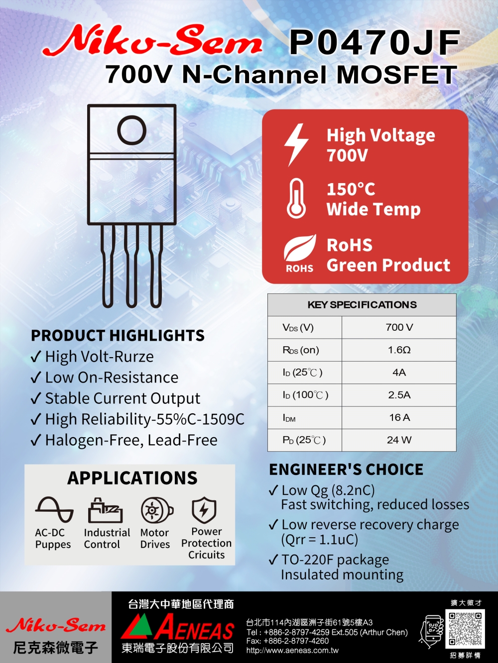 Nikosem P0470JF - 700V N-Channel MOSFET|高壓低RDS(on)電源開關晶體,適用AC-DC、馬達驅動、工業控制與電源保護電路。
